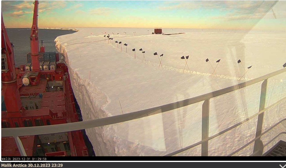 Bob has sent in this picture, taken by the Malik Arctica webcam, of the vessel alongside the Brunt Ice Shelf during the 2023/24 relief. Midnight at Halley Relief; looks quite familiar (and no blegs on the slide!)Chris Gostick says: Thanks Bob. Yes, certainly a fine sight to be reminded of - but the Ice shelf seems very much lower than at was in the late 1960s -- unless my memory is even worse than I think it is these days! The Malik Arctica webcam can be found here: www.webcamgalore.com/webcam/Royal-Arctic-Line/Malik-Arctica/30924.html |